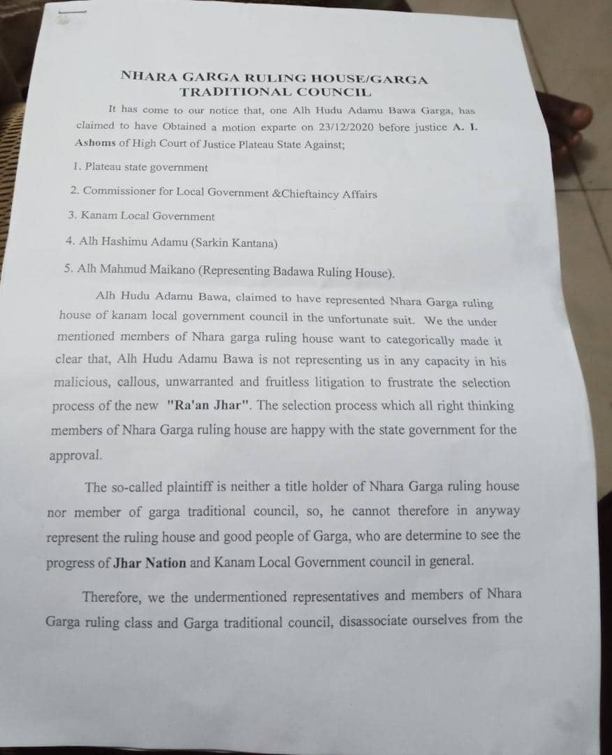 The Nhara Garga Ruling House and Garga Traditional Council in kanam Local Government of Plateau State has issued a disclaimer against one Alhaji Hudu Adamu Bawa Garga who claimed to have represented them and obtained a motion exparte on the 23rd December, 2020 before Justice A. I. Ashoms of High Court of Justice Plateau State against the Plateau State Government, commissioner local government and Chieftaincy Affairs, Kanam Local Government, Alhaji Hashimu Adamu (Sarkin Kantana) and Alhaji Mahmud Maikano ( Representing the Badawa Ruling House).
