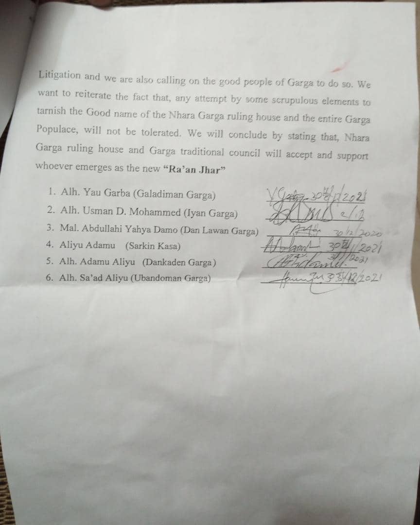 In a Press Statement signed and issued by six traditional titles holders of Nhara Garga Ruling House to include; Alh. Yau Garba (Galadima Garga), Alh. Usman D. Mohammed (Iyan Garga), Mal. Abdullahi Yahya Damo (Dan Lawan Garga ) and Aliyu Adamu (Sarkin Kasa). Others are Alh. Adamu Aliyu (Dankada Garga) and Alh. Sa’ad Aliyu (Ubandoman Garga), said Alh. Hudu Adamu Bawa is not representing them in any capacity in his malicious, callous, unwarranted and fruitless litigation to frustrate the selection process of the new “Ra’an Jhar”.