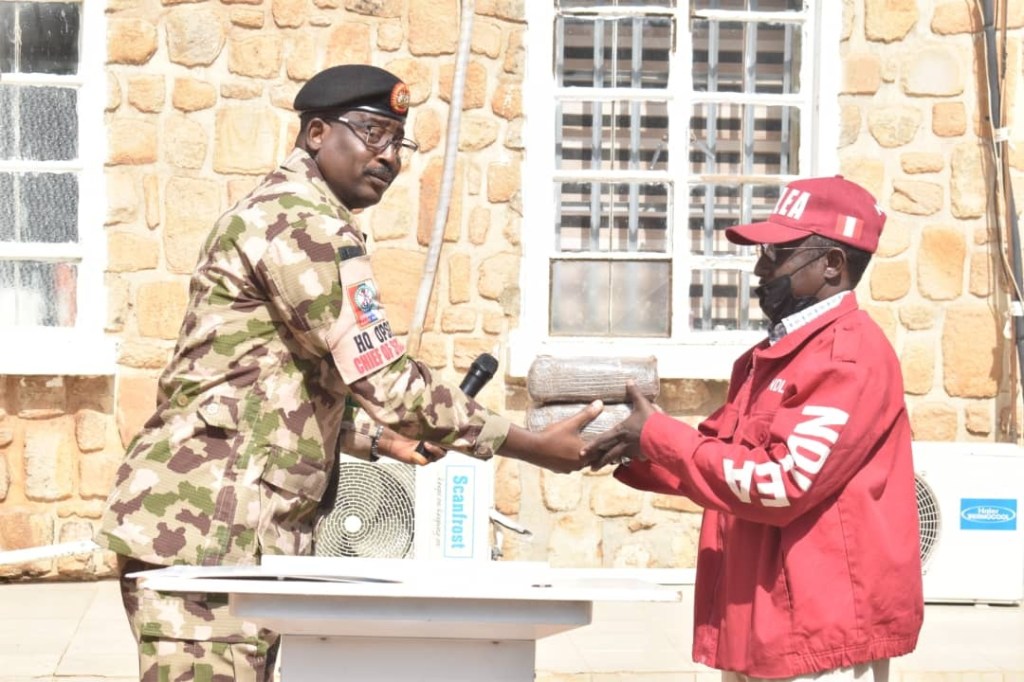 “On pursuit, troops shot at the vehicle. One of the suspects lost his life as a result of gunshot wounds, while the other occupants escaped into the bush. The deceased was later identified as Danjuma Salisu. Items recovered from the car include 314 parcels of substances suspected to be cannabis sativa, 2 fake military and Department of State Services ID cards bearing the deceased name, Motorola Radio and the sum of Ten Thousand Naira (N10,000:00) only were recovered.